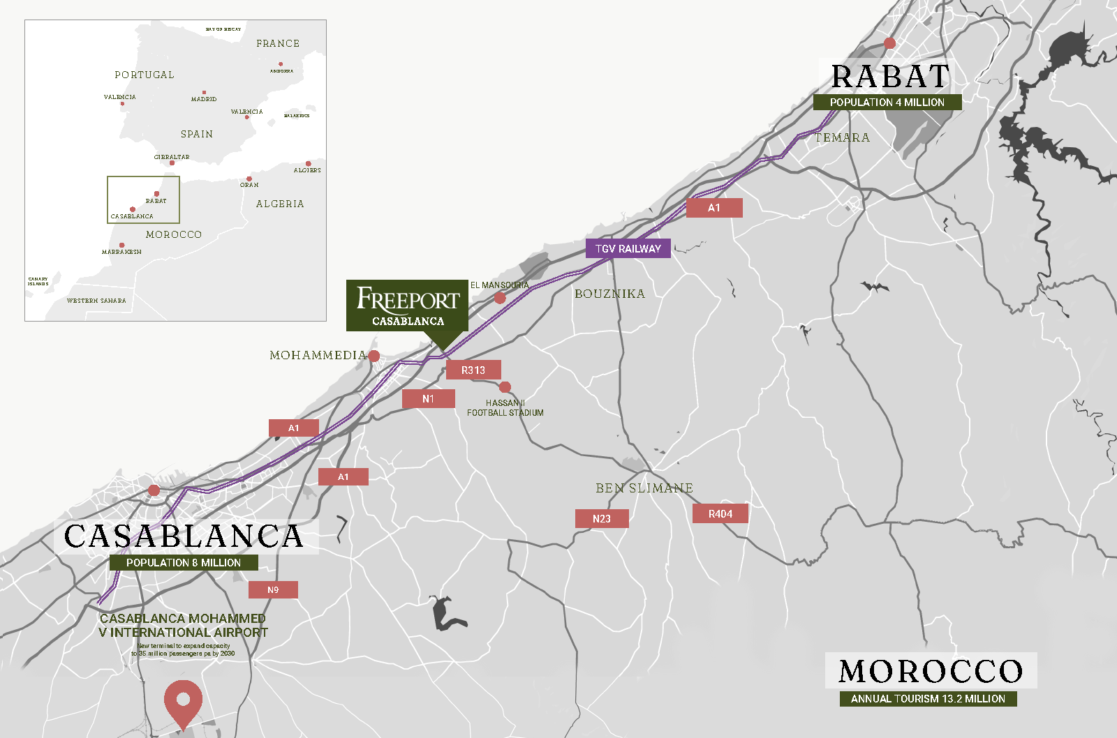 In 2030, Morocco will host the soccer World Cup and is building the largest stadium in the world – 115,000 seats – at Ben Slimane within 15 minutes of Freeport Casablanca.